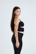 Top elaborado en nylon, con forro en los cortes delanteros para mayor seguridad y varillas plásticas laterales que aportan forma y estructura. Tiene tiras ajustables y herrajes en zamac que enmarcan el diseño al frente.