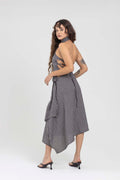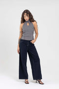 El diseño se ajusta al cuerpo con tiras tipo corset que se amarran en la espalda, permitiendo personalizar el ajuste y acentuar la cintura. Una prenda que equilibra dulzura y carácter, ideal para jugar con contrastes en tus looks.