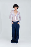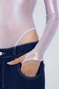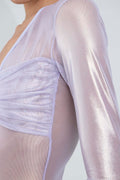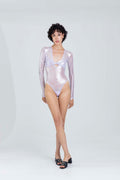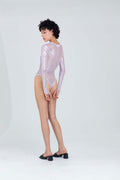 Confeccionado en una malla brillante y translúcida que envuelve el cuerpo con suavidad, este diseño incorpora copas para darte soporte sin perder transparencia. El escote profundo con cut-out central crea una línea visual poderosa, mientras las mangas largas estilizan el torso y añaden ese toque seductor que distingue las piezas de La Bloom.