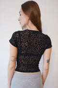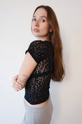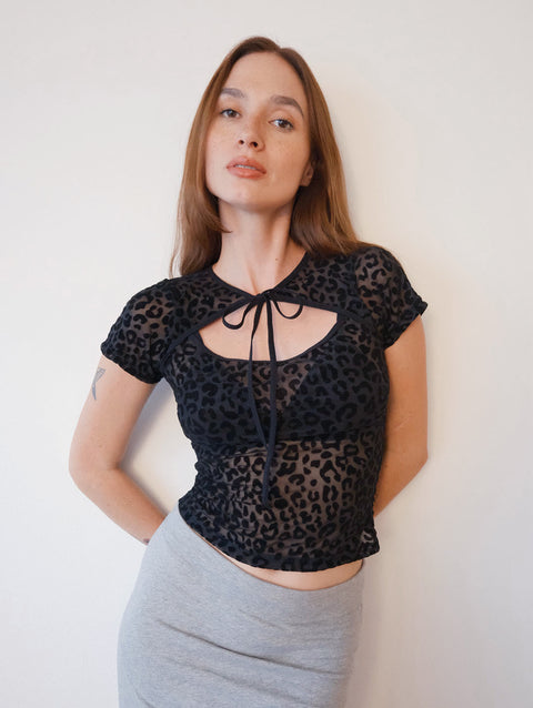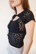 La textura en velvetín crea un contraste sutil entre transparencia y profundidad, resaltando el estampado con un acabado táctil y visual único.