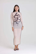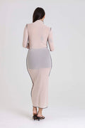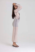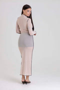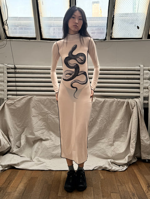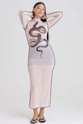 Vestido largo elaborado en mallatex 100% poliéster, estampado localizado en centro frente, manga larga y con costuras expuestas tipo rouche.